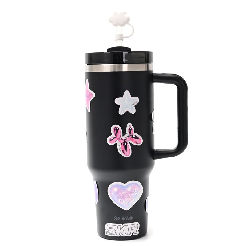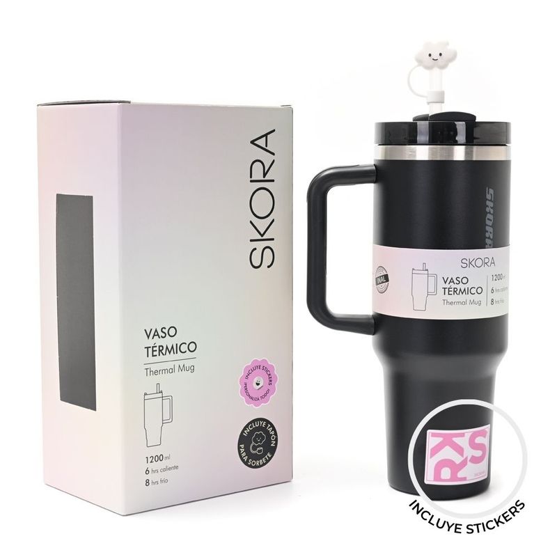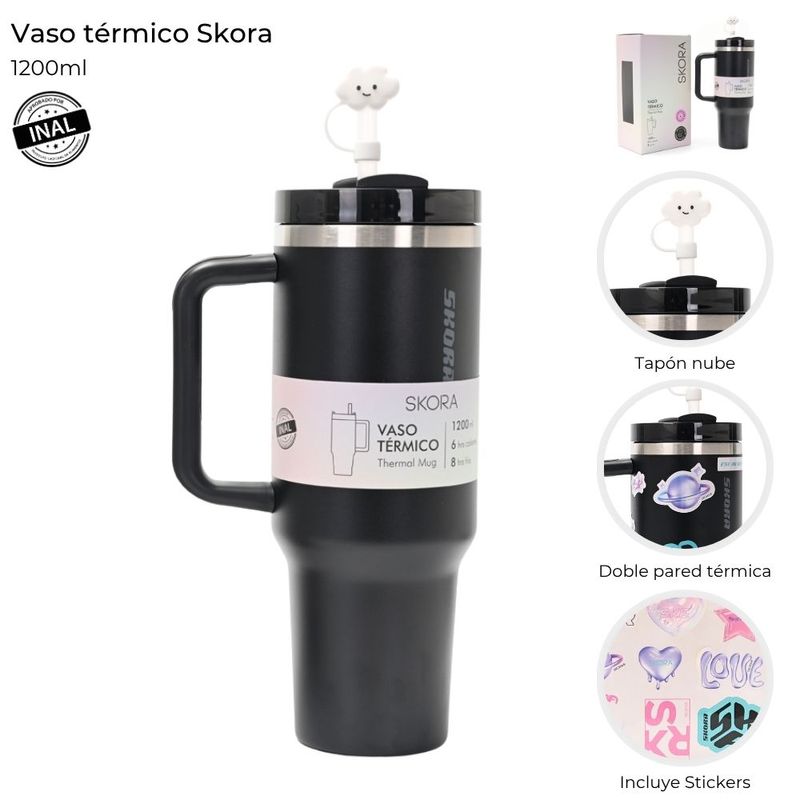 El vaso térmico Wanderlust de 1200 ml es ideal para mantener tus bebidas calientes o frías por horas, gracias a su doble pared de acero inoxidable que aísla la temperatura. Incluye bombilla reutilizable, tapa hermética y tapón en forma de nube para evitar derrames. Su diseño ergonómico con acabado mate antideslizante ofrece un agarre cómodo, y su boca ancha facilita la limpieza y el agregado de hielo. Es perfecto para el uso diario, en casa, el trabajo o al aire libre. Además, incluye stickers para personalizarlo y es reutilizable, siendo una opción práctica y sustentable.