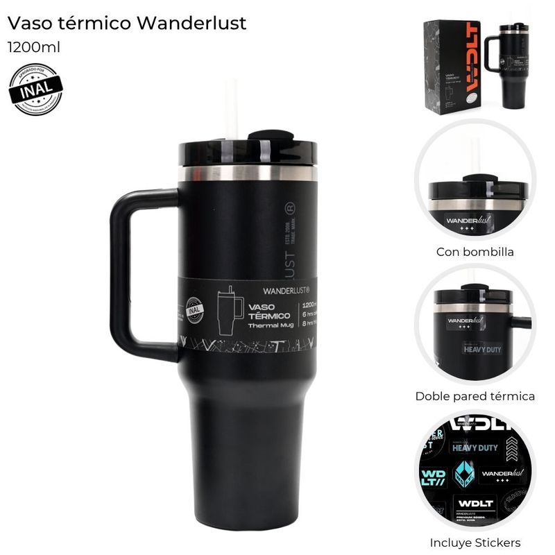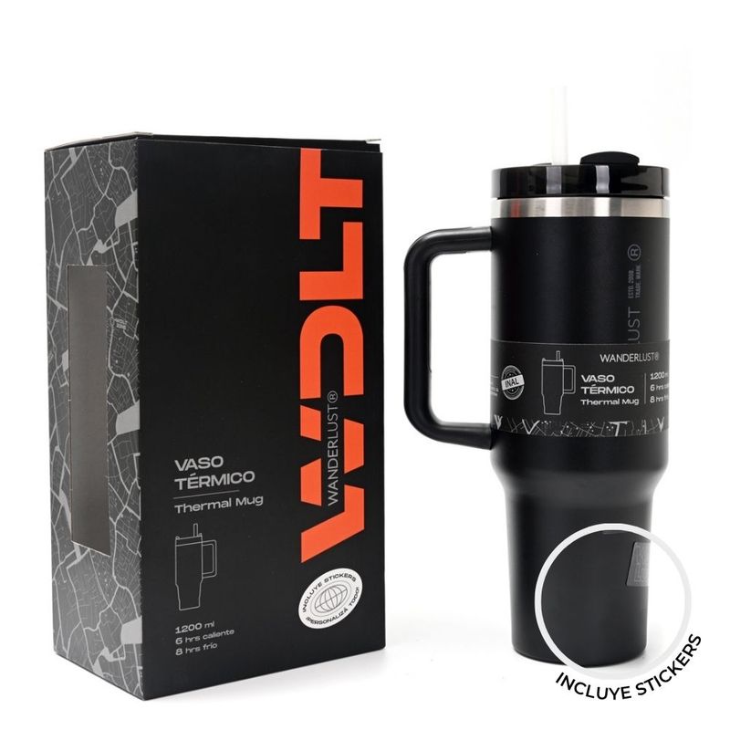 El vaso térmico Wanderlust de 1200 ml es ideal para mantener tus bebidas calientes o frías por horas, gracias a su doble pared de acero inoxidable que aísla la temperatura. Incluye bombilla reutilizable, tapa hermética y tapón en forma de nube para evitar derrames. Su diseño ergonómico con acabado mate antideslizante ofrece un agarre cómodo, y su boca ancha facilita la limpieza y el agregado de hielo. Es perfecto para el uso diario, en casa, el trabajo o al aire libre. Además, incluye stickers para personalizarlo y es reutilizable, siendo una opción práctica y sustentable.