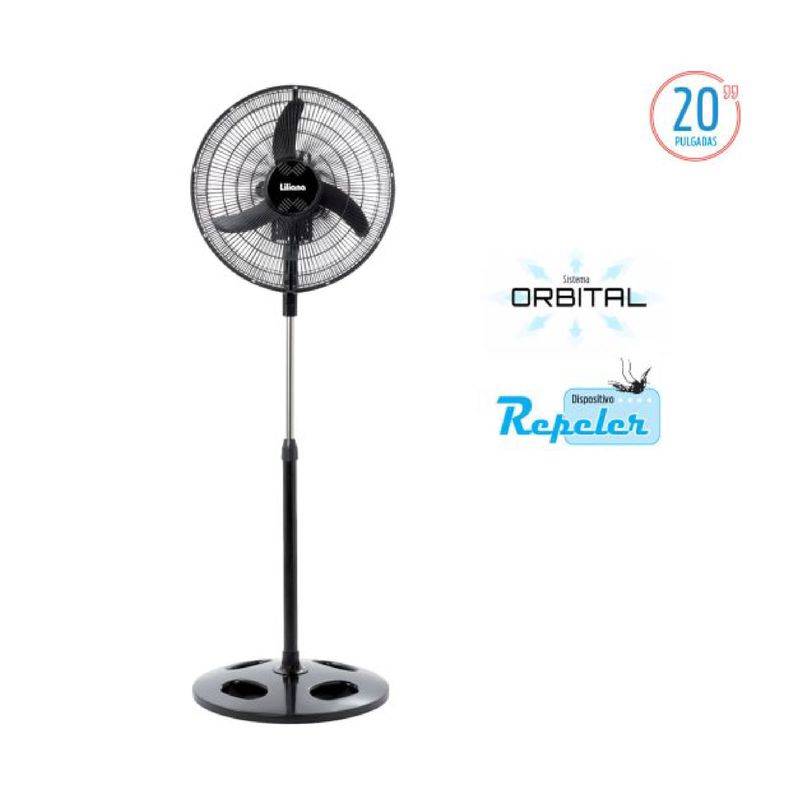 Este ventilador de pie cuenta con un barral telescópico extensible de metal que alcanza una altura máxima de 1.70 metros. Sus tres aspas negras y la parrilla metálica negra no solo brindan un diseño atractivo, sino también un rendimiento eficiente. Con una base redonda, este ventilador es súper silencioso y ofrece tres velocidades para adaptar el flujo de aire a tus preferencias. Su diámetro de 20 pulgadas y potencia de 90 watts garantizan un funcionamiento efectivo, mientras que sus medidas de 57,4x16x75,5 cm lo hacen práctico para cualquier espacio.El sistema orbital es una de sus características más destacadas, ya que direcciona la brisa de manera horizontal y vertical. Esto permite que el cabezal del ventilador se desplace sobre su eje en forma elíptica, distribuyendo la brisa fresca de manera suave y uniforme hacia ambos lados y hacia arriba y abajo. Además, cuenta con un dispositivo repelente que permite colocar una tableta estándar de insectos, cuyas partículas son dispersadas por las aspas del ventilador en todo el ambiente, creando un entorno más cómodo y libre de insectos. Este ventilador es una excelente opción para quienes buscan frescura y confort en su hogar. agradable sensación de frescura y bienestar.