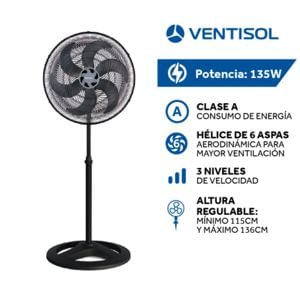 El Ventisol Ventilador de Pie 18″ 135 W es un modelo potente pensado para espacios amplios. Su motor-turbo entrega un flujo de aire intenso y constante, mientras que su diseño con 6 aspas aerodinámicas garantiza una ventilación eficiente. Gracias a su altura regulable y oscilación, podés dirigir el aire donde más lo necesitas.
