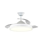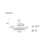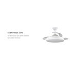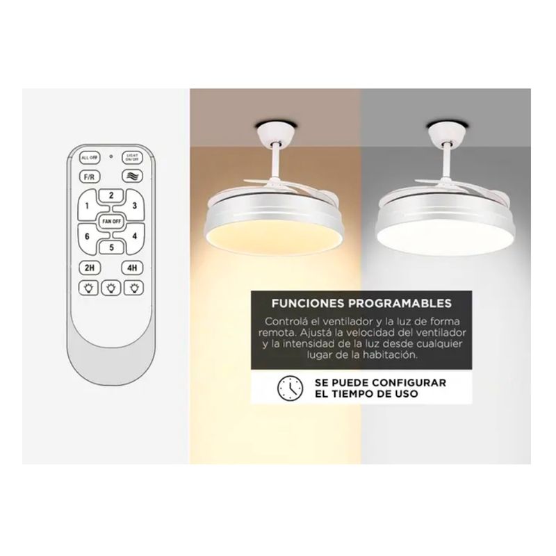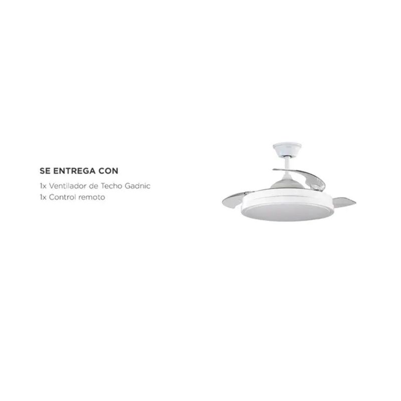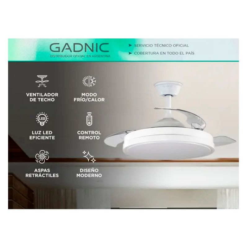 El Ventilador de Techo ClimaLed Gadnic (VENTLUZ01) posee 3 aspas retráctiles y luz LED integrada, diámetro de 52 pulgadas (132 cm), motor de 36 W, tres velocidades, rotación reversible, flujo de aire de hasta 5.000 CFM y bajo nivel de ruido. Color: blanco con aspas transparentes. Origen: China. Garantía: 12 meses.