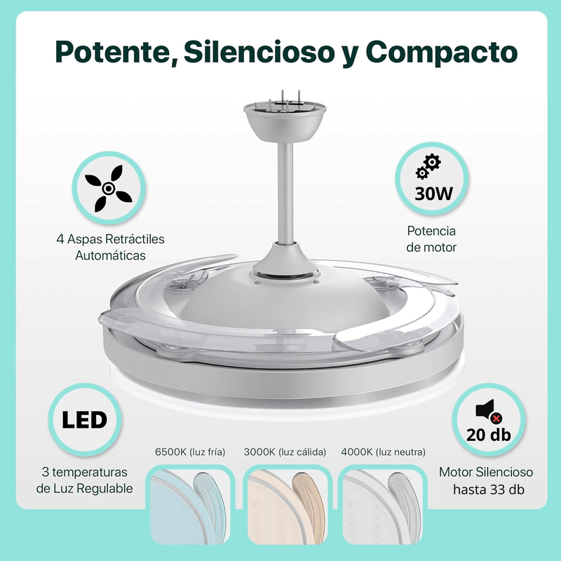 - 4 aspas transparentes: Para un flujo de aire uniforme y estético.