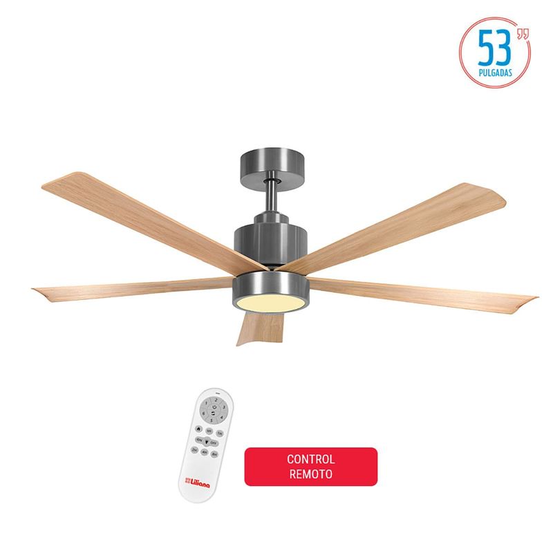 El Ventilador De Techo Liliana VTHM935R combina un diseño elegante con la máxima eficiencia en ventilación e iluminación. Su cuerpo con acabado en níquel cepillado y sus 5 palas símil madera aportan un toque moderno, mientras que el motor de alto rendimiento y las funciones LED avanzadas garantizan confort y ahorro.