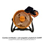 Disfrutá de ventilación portátil y sin cables con el Lüsqtoff VPL2500-8B, ideal para talleres, obras y exteriores. Funciona con una batería de 18V 4.0 amp, incluida junto con su cargador, y lo mejor es que es intercambiable con otras herramientas Lüsqtoff de 18V (No eco-line). Su diseño compacto y resistente, junto con sus aspas de 24 cm y velocidades ajustables de 1500 a 2500 RPM, garantizan una ventilación potente donde la necesites.