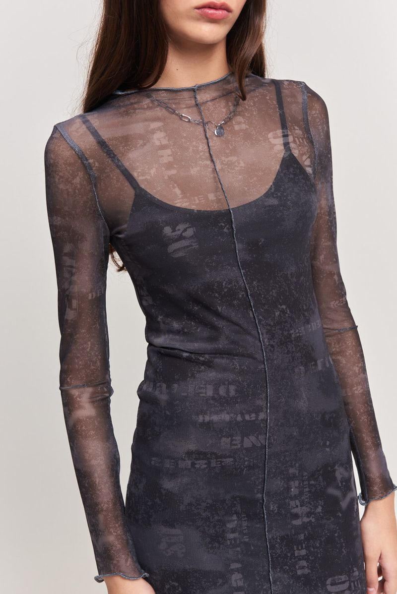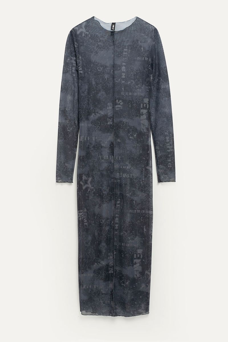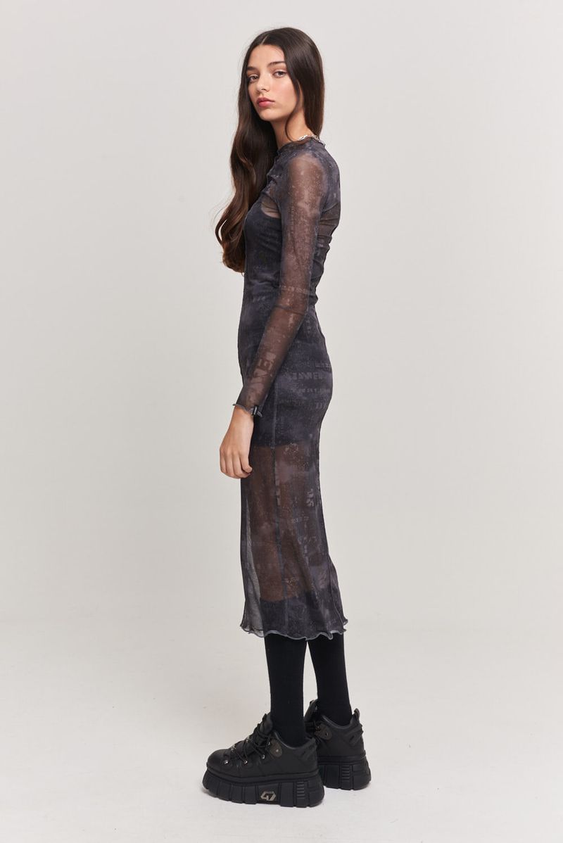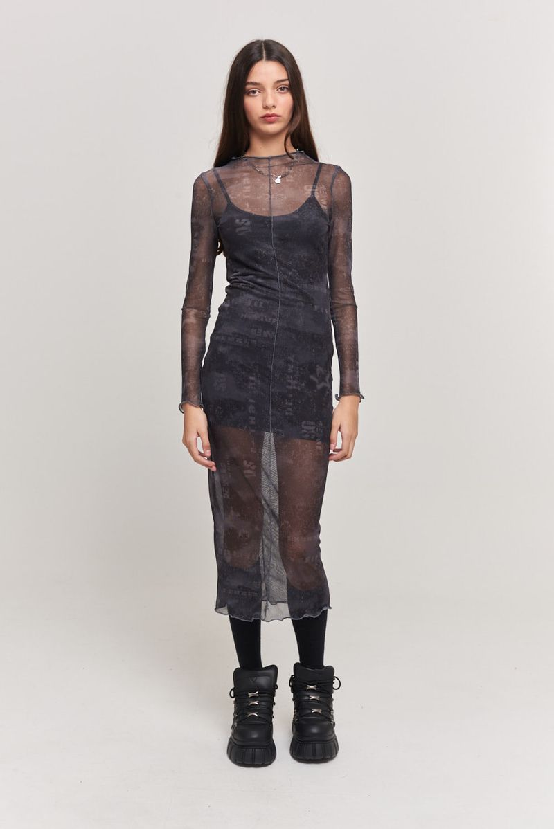 Vestido de microfibra estampado full print manga larga con recorte delantero y rulote en mangas, ruedos y cuello. Largo a los tobillos.