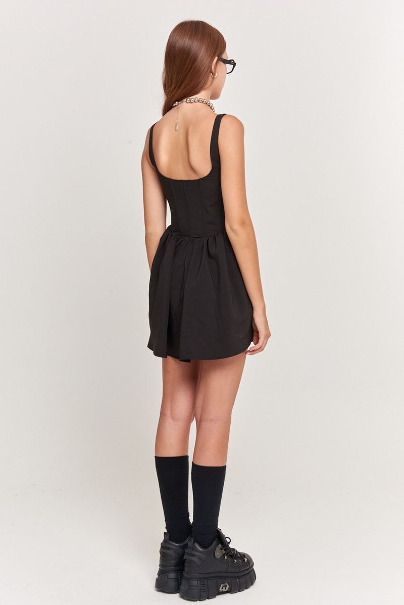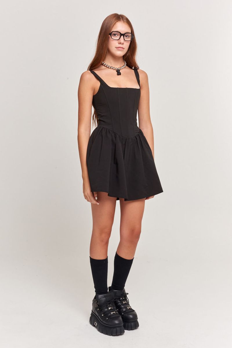 Vestido corto de microfibra elastizada, con pechera tipo corset entallado, falda con vuelo y bolsillos laterales. Acceso mediante cierre invisible lateral.