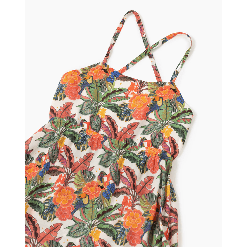 Vestido confeccionado en fibrana estampada especialmente diseñada para esta colección. Posee escote en espalda y juego de lazos que cruzan y se ajustan al cuerpo para que quede fija la pechera y se adapte a los cuerpos. Calce fit en top y amplio en falda. Es fresco y canchero para pasar el verano.