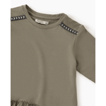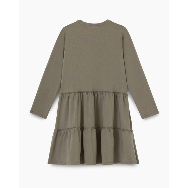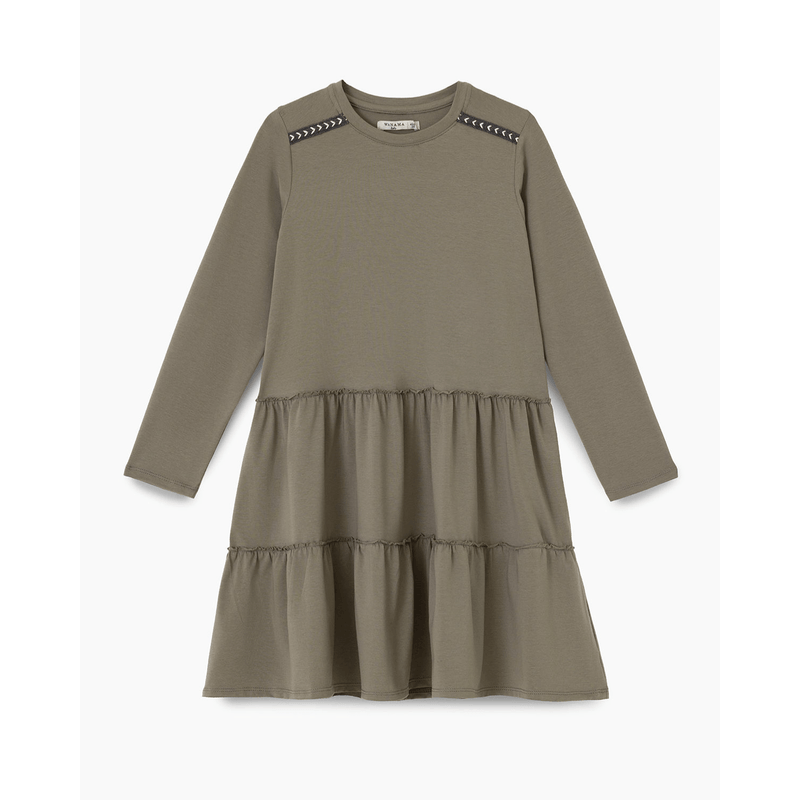 El Vestido Nahia combina comodidad y tendencia. Confeccionado en algodón con lycra, presenta detalles de cinta a contratono en los hombros y un recorte con frunces que aporta vuelo a la falda.