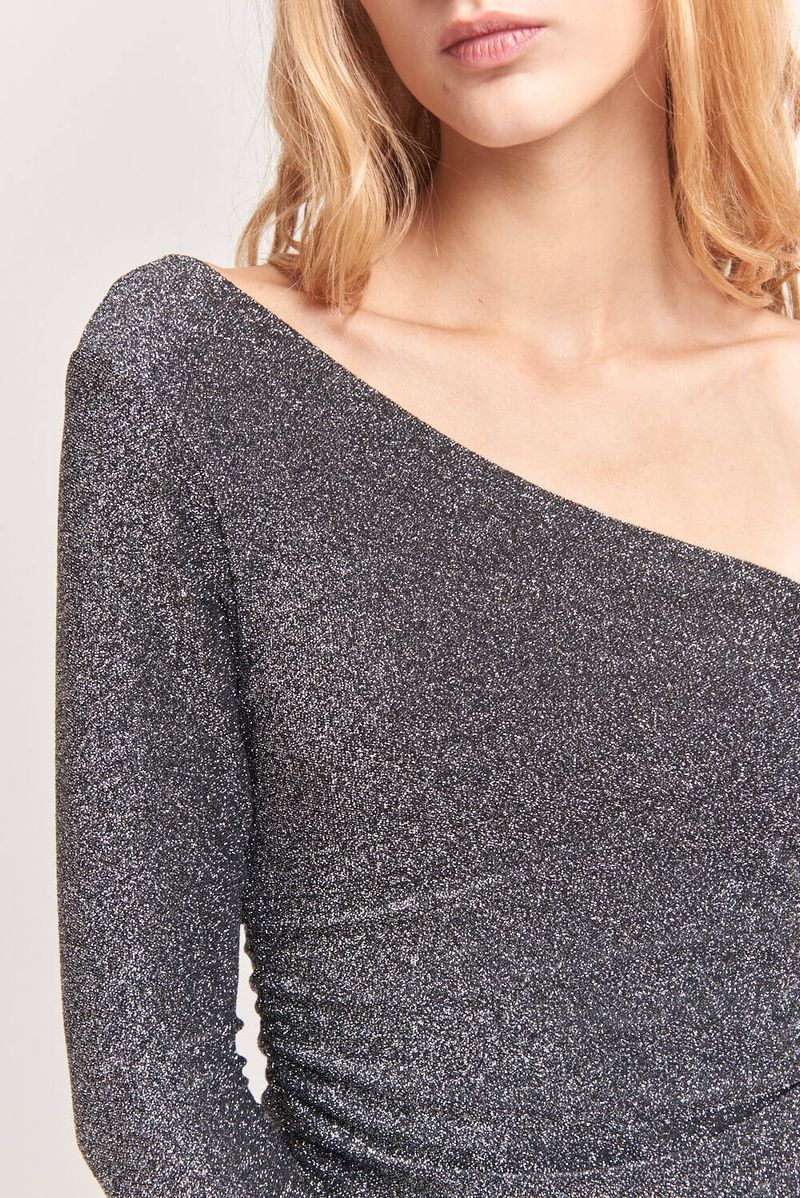 Vestido de lurex al cuerpo, de una manga. Lateral fruncido y forrado con crepe media.