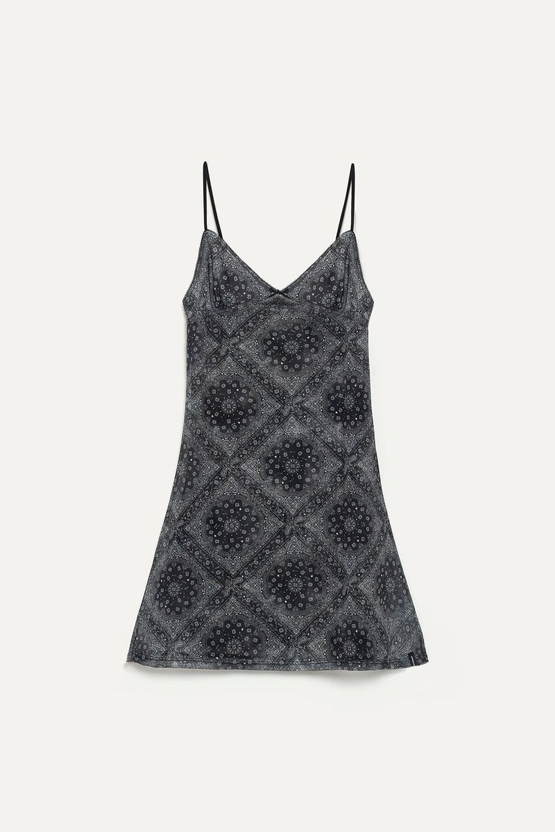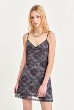 Vestido corto de microtul estampado con diseño exclusivo de la marca. Largo hasta arriba de las rodillas, con breteles regulables, detalle de picot y pequeño moño en el escote. Ideal para looks de día con zapatillas blancas o de noche con sandalias negras.