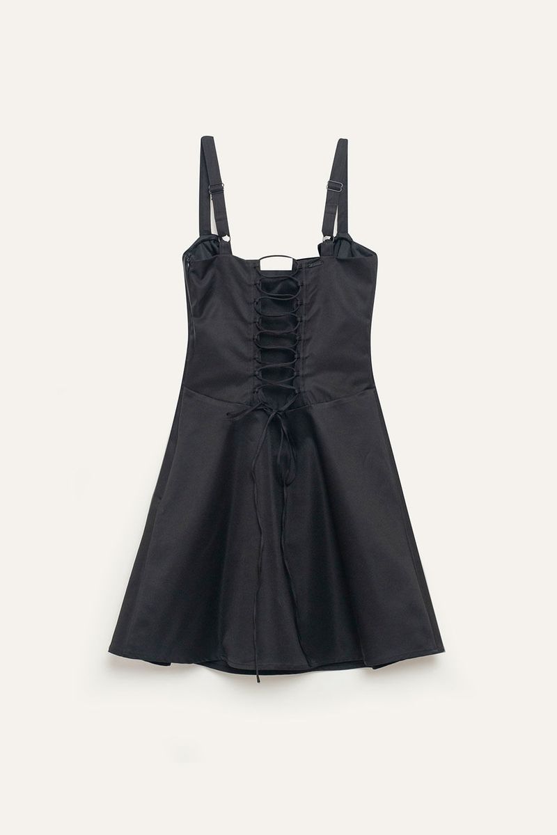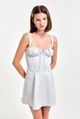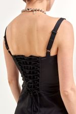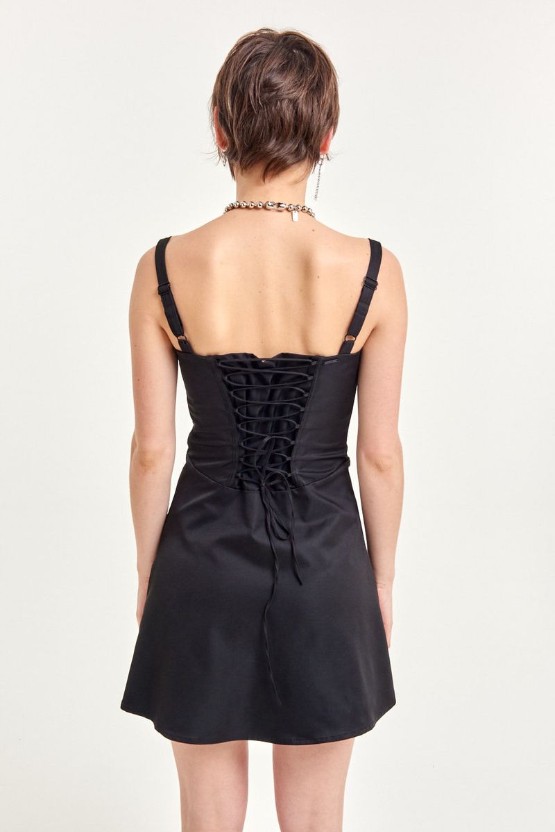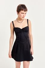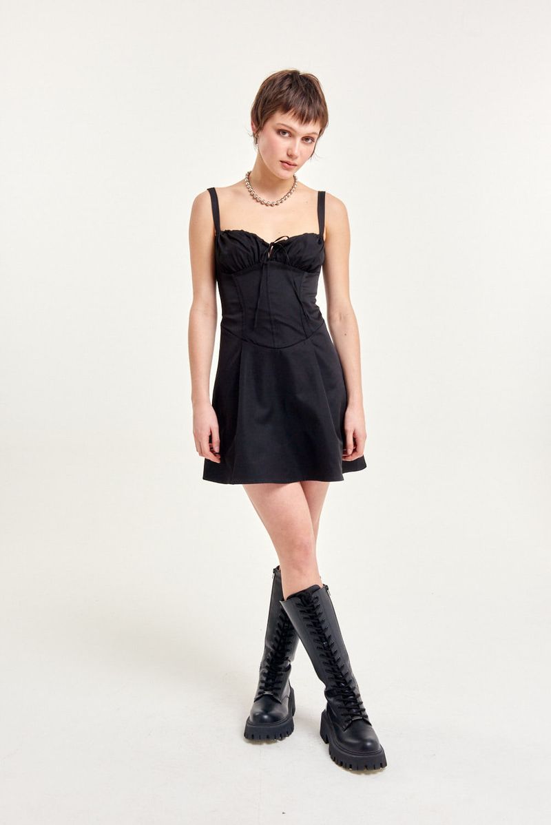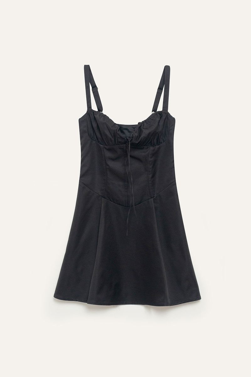 Vestido corto tipo corset con detalle de frunce en escote y estructura interna con ballenas. Breteles regulables, espalda entrelazada con lazo y cierre lateral invisible. Sofisticado, ideal para salidas o eventos.