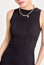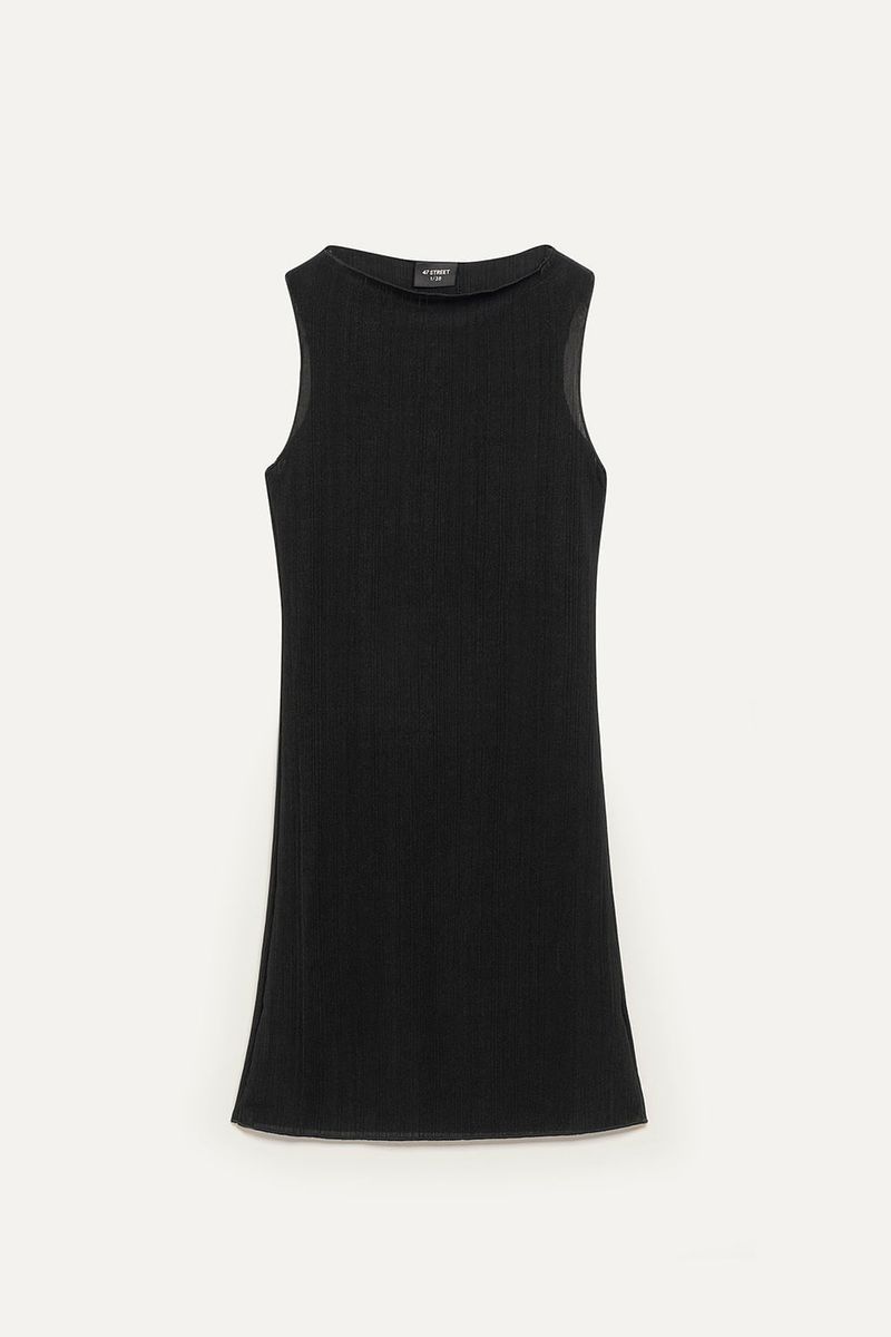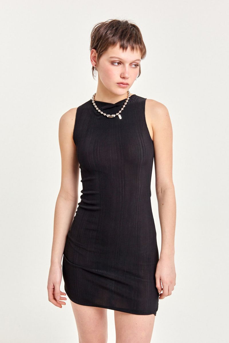 Vestido corto de morley fantasía con cuello abierto y terminación en roulotte. Su largo cae apenas por encima de las rodillas, con un calce al cuerpo que estiliza. Queda perfecto con campera y botas para un look nocturno.