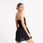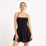 Detalles: Vestido ajustado, de punto smock en la parte superior, con breteles finos elastizados y cruzados en espalda. Falda con volado. Aplique metálico de marca.