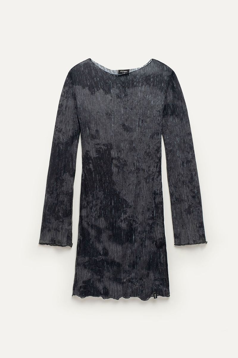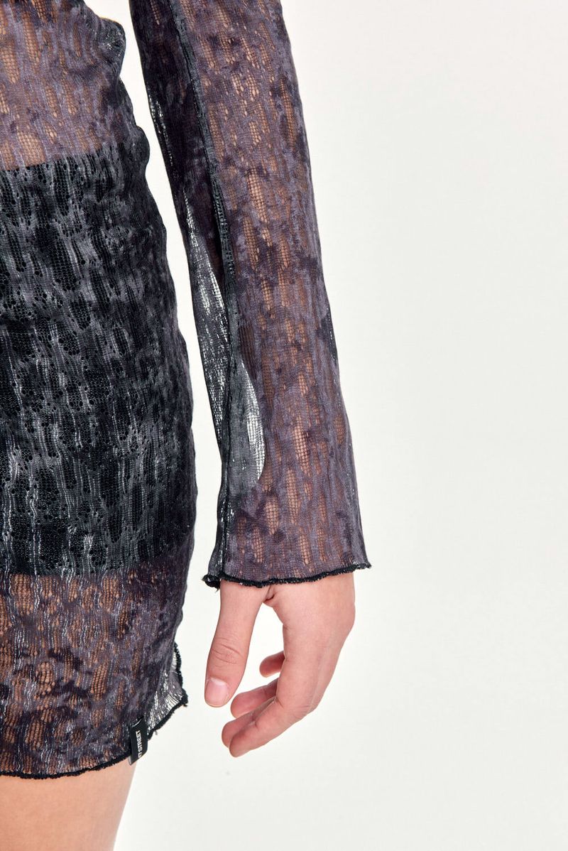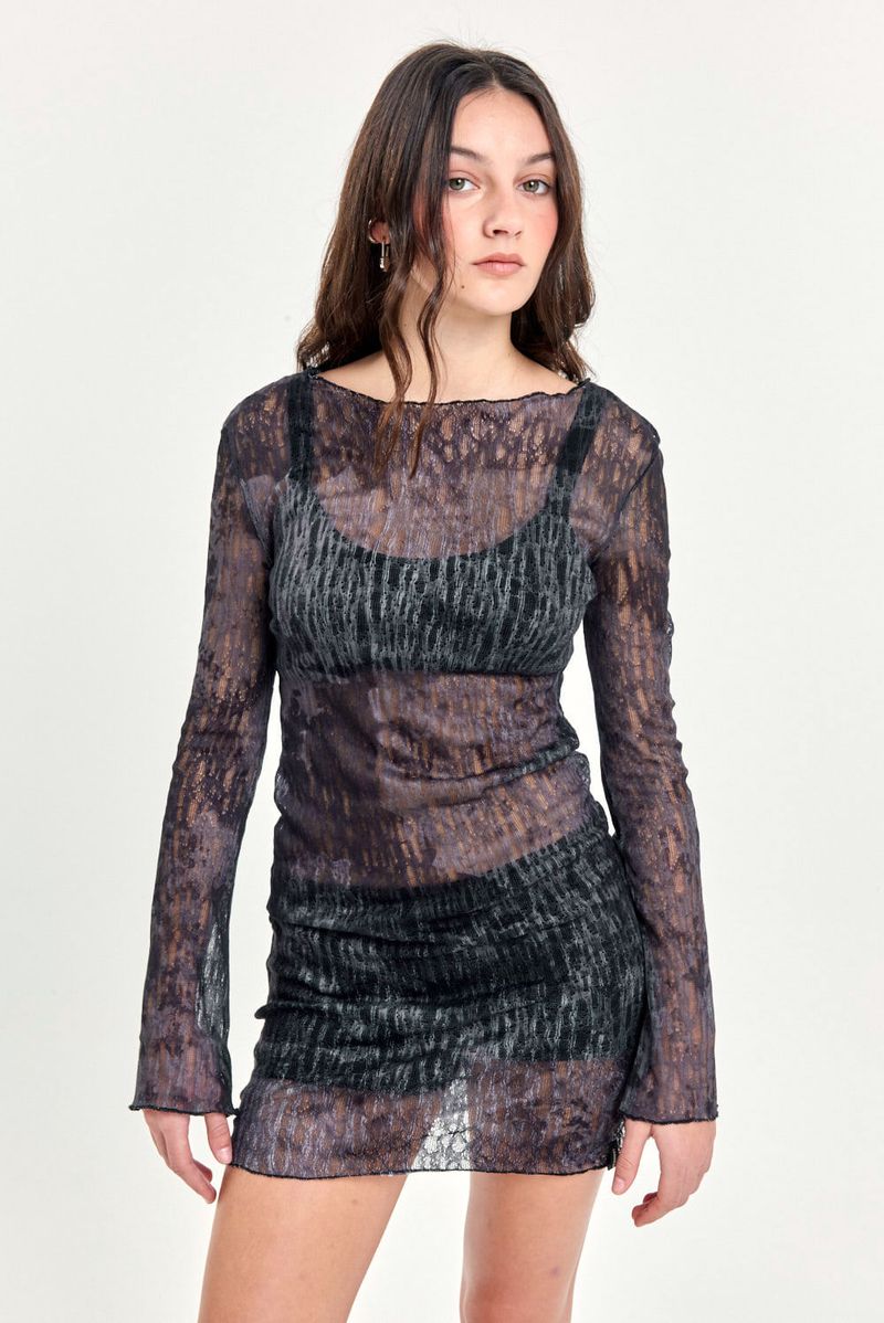 Vestido de manga larga de red con diseño sublimado. Terminaciones con ruedo roulotte y etiqueta de marca. Perfecto para looks alternativos y superposiciones.