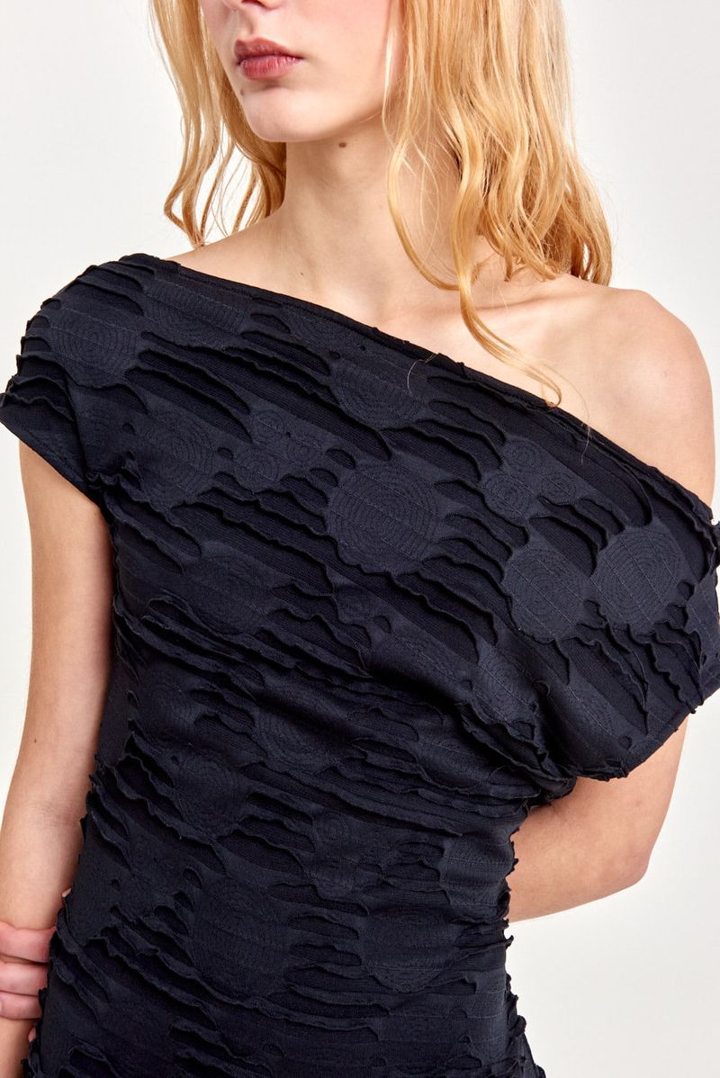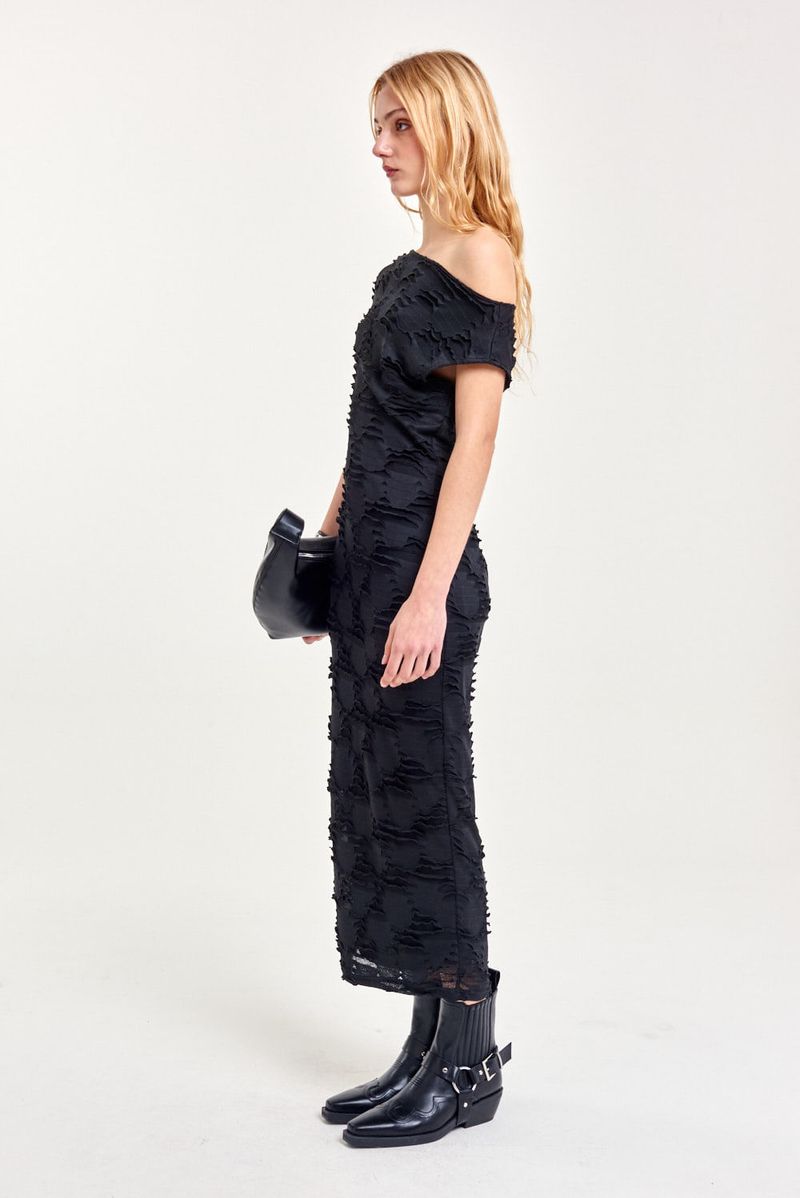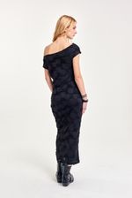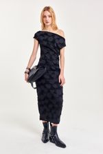 Vestido largo de microtul con mangas asimétricas y textura en relieve que aporta un toque elegante. Su calce es ajustado, realzando la silueta. Ideal para combinar con sandalias o botas y un blazer corto para un look de noche.