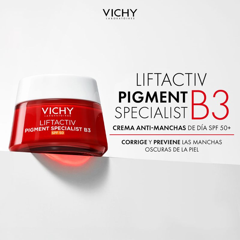 Vichy Liftactiv Pigment Specialist B3 SPF50 es un tratamiento facial antimanchas que corrige la hiperpigmentación, previene la aparición de nuevas manchas y protege contra el daño solar. Con