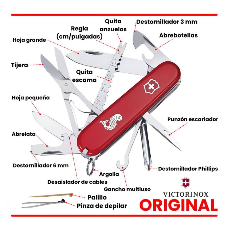 Navaja de bolsillo mediana con 17 funciones para pesca.