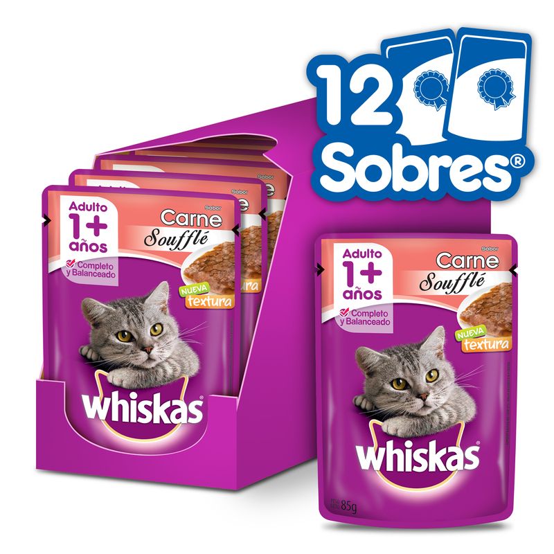 WHISKAS ALIMENTO HÚMEDO SOBRECITO GATO CARNE SOUFFLÉ 12 UN