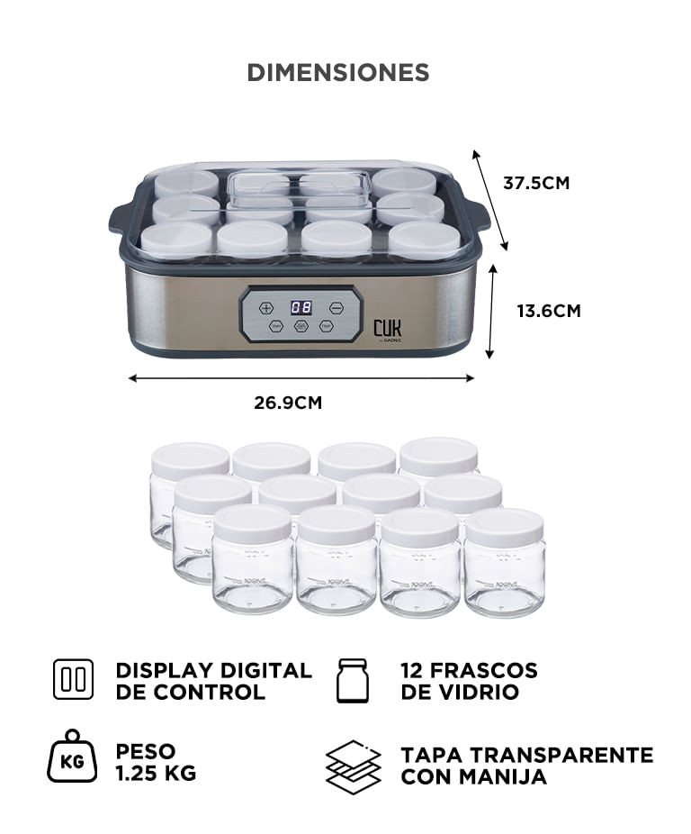 Incluye 12 frascos de vidrio reutilizables para preparar porciones individuales sin conservantes.