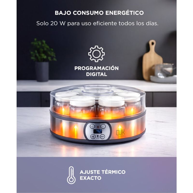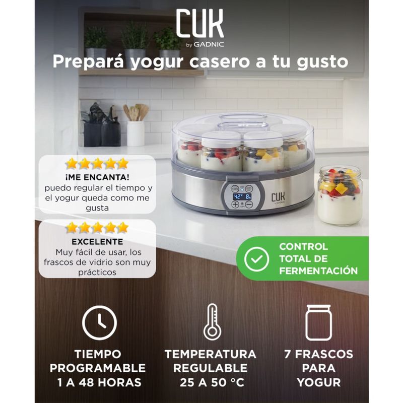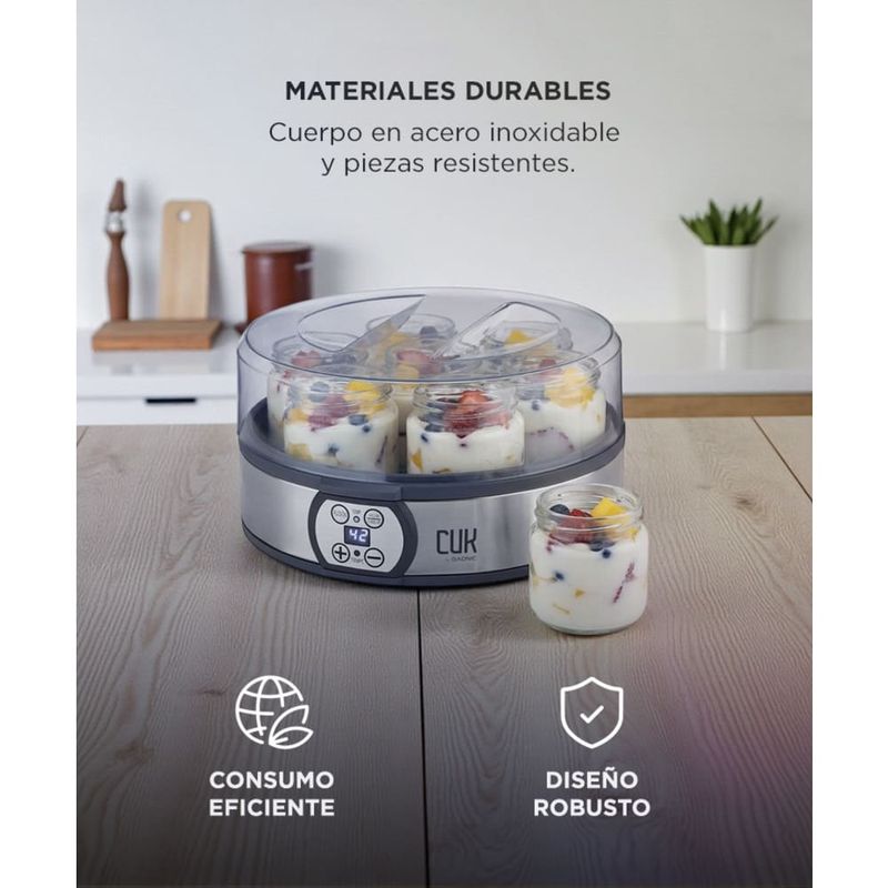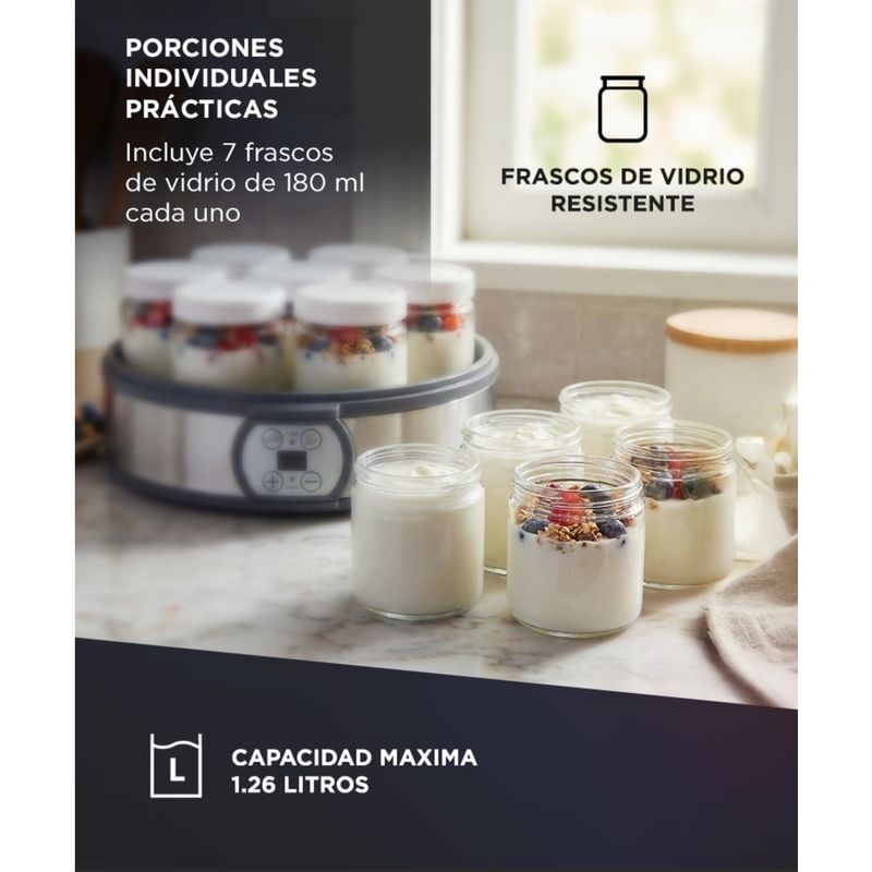 Prepará yogur casero sin conservantes ni aditivos. Su rango de temperatura y fermentación controlada permite obtener yogur firme o estilo griego con mayor densidad.