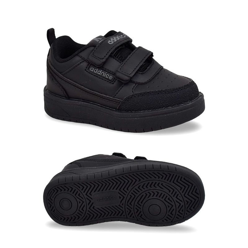 Estas zapatillas Addnice Skate combinan un estilo urbano atemporal con la practicidad que los padres necesitan. Su diseño en negro monocromático les da un look canchero y versátil, ideal tanto para el jardín como para salidas casuales. Olvidate de los cordones; el sistema de doble abrojo (velcro) permite un ajuste rápido y seguro, facilitando que los niños se las pongan y quiten con independencia. Cuentan con una capellada sintética de fácil limpieza y una puntera reforzada para resistir el uso constante y los juegos.