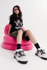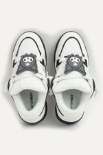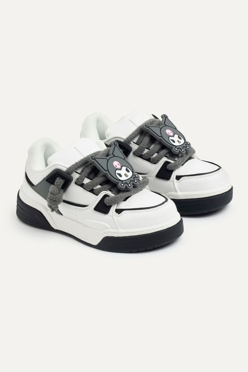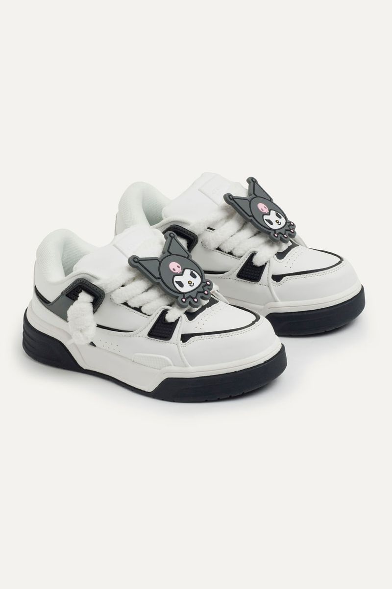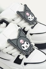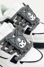 Zapatillas de símil cuero con accesorio extraíble de Kuromi hecho de silicona. Viene con cordones chunky afelpados blancos, y a su vez, un par extra en color gris. La lengüeta de la zapatilla es super acolchonada y cómoda. Las zapatillas vienen en una caja especial de Hello Kitty and Friends. Producto con licencia oficial de Sanrio.