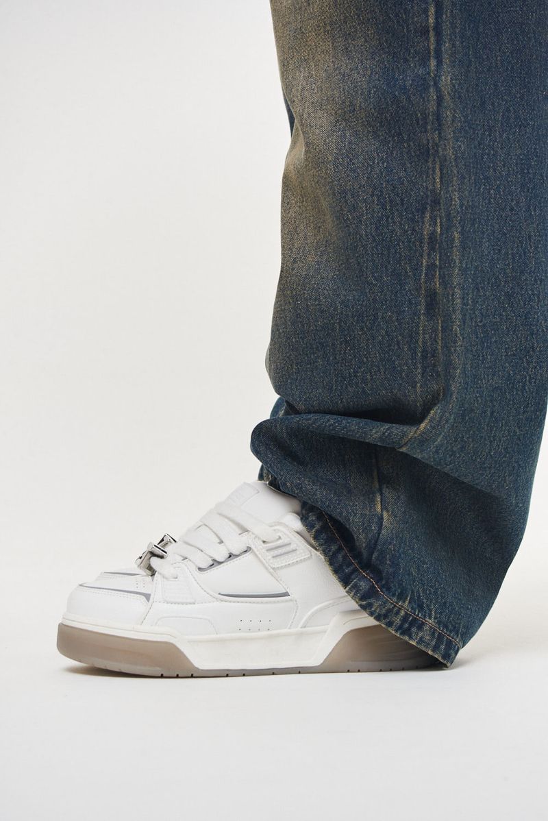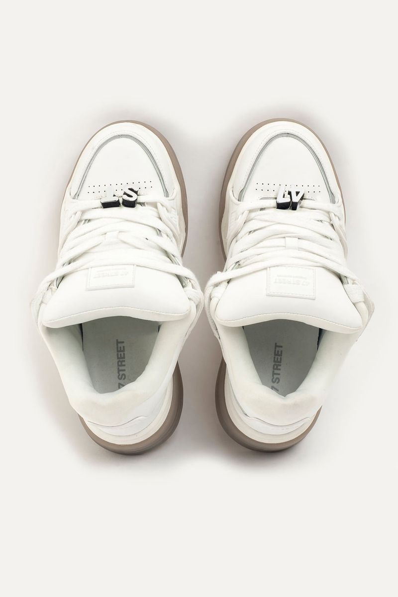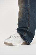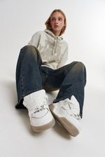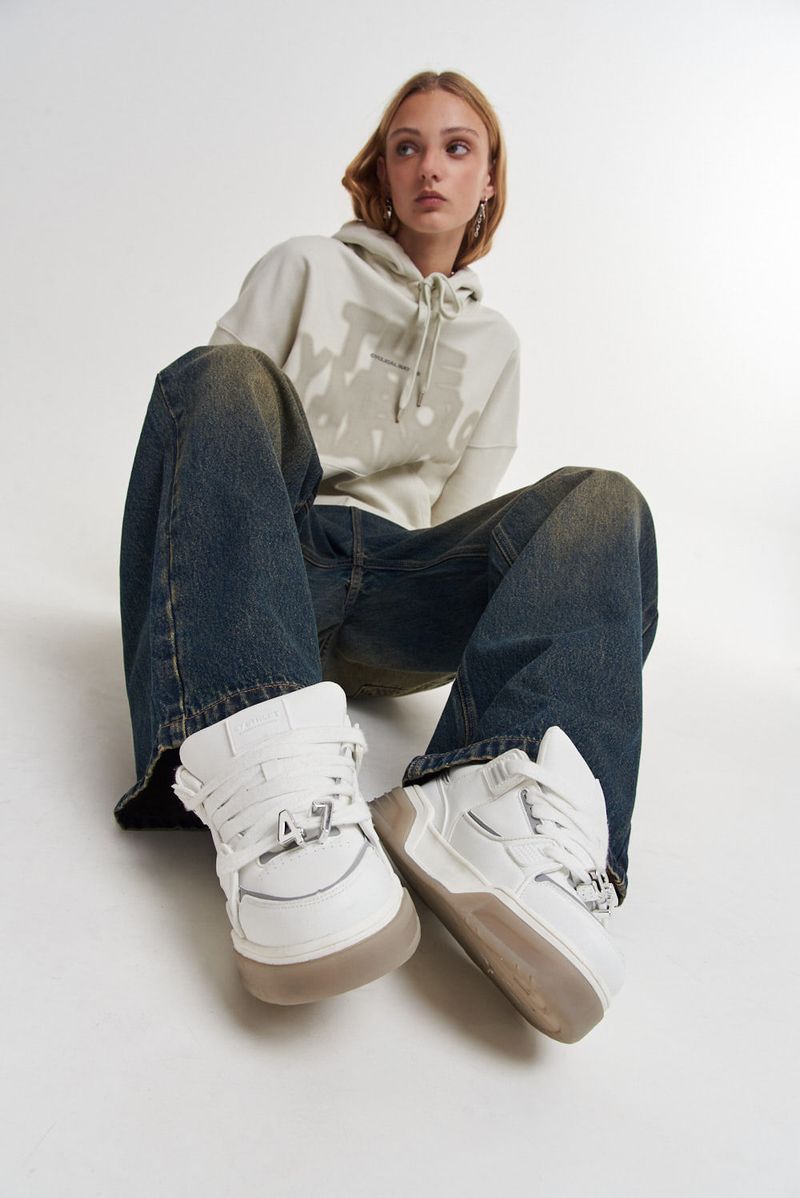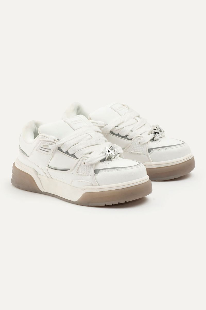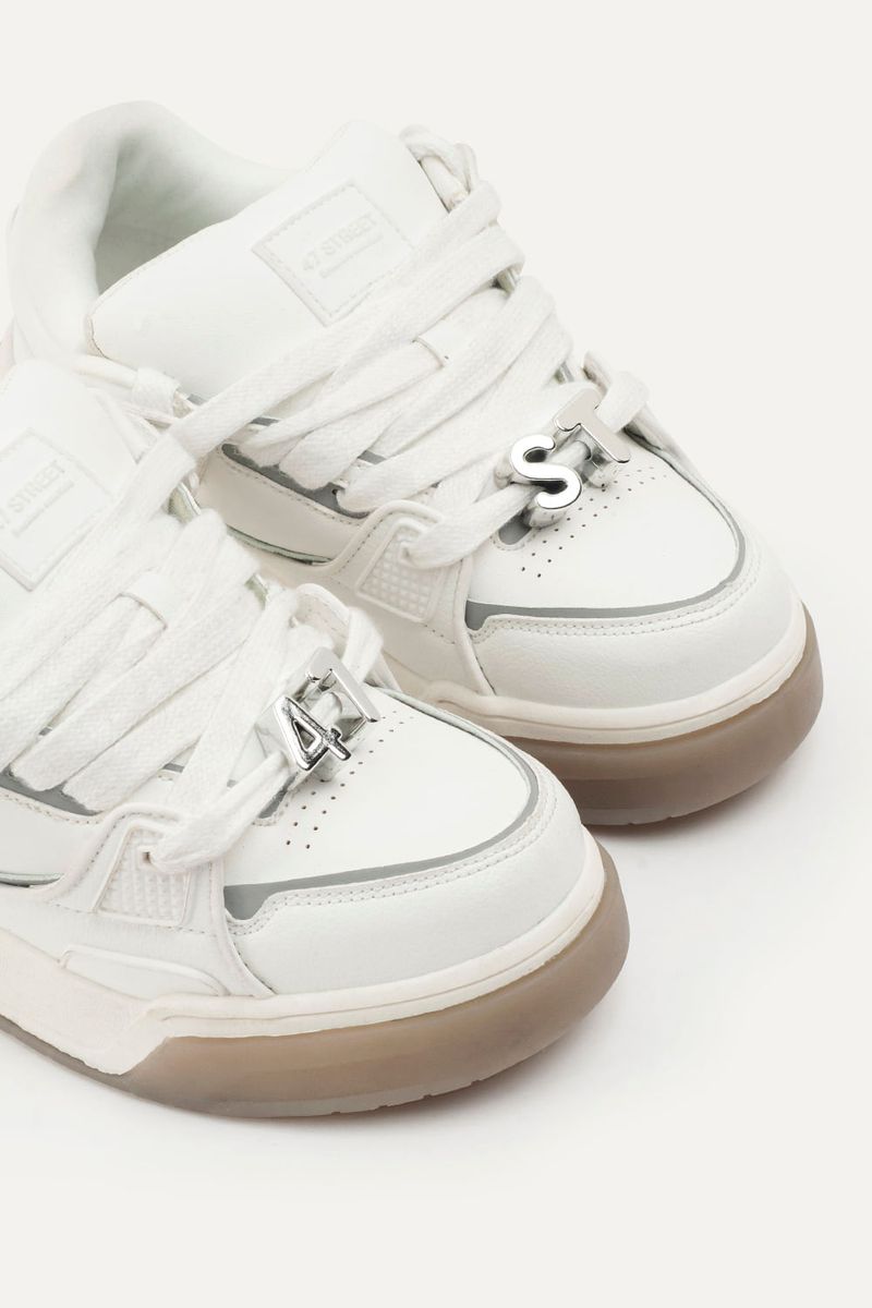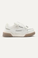 Zapatillas de sÍmil cuero con recortes superpuestos de sÍmil cuero graneado. Con base bicolor y cordones en cinta con puntera de acetato. Cuenta con dijes plateados extra para accesorizar los cordones.