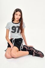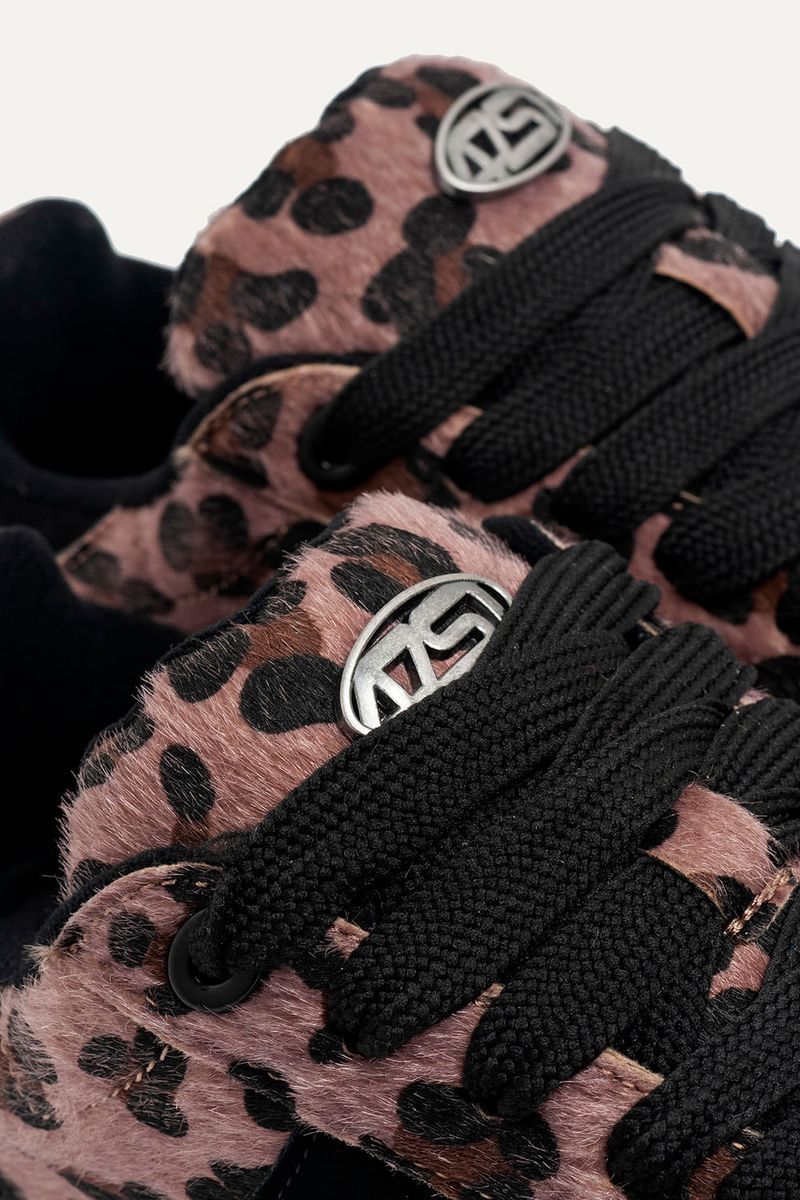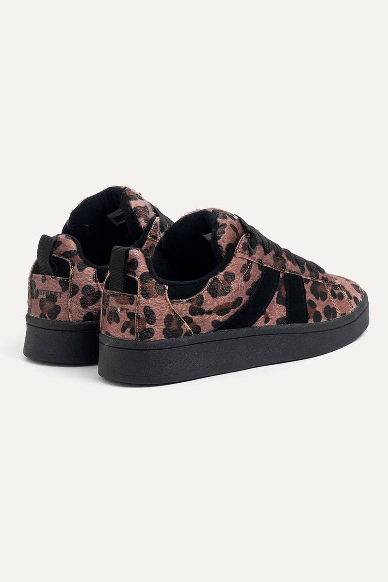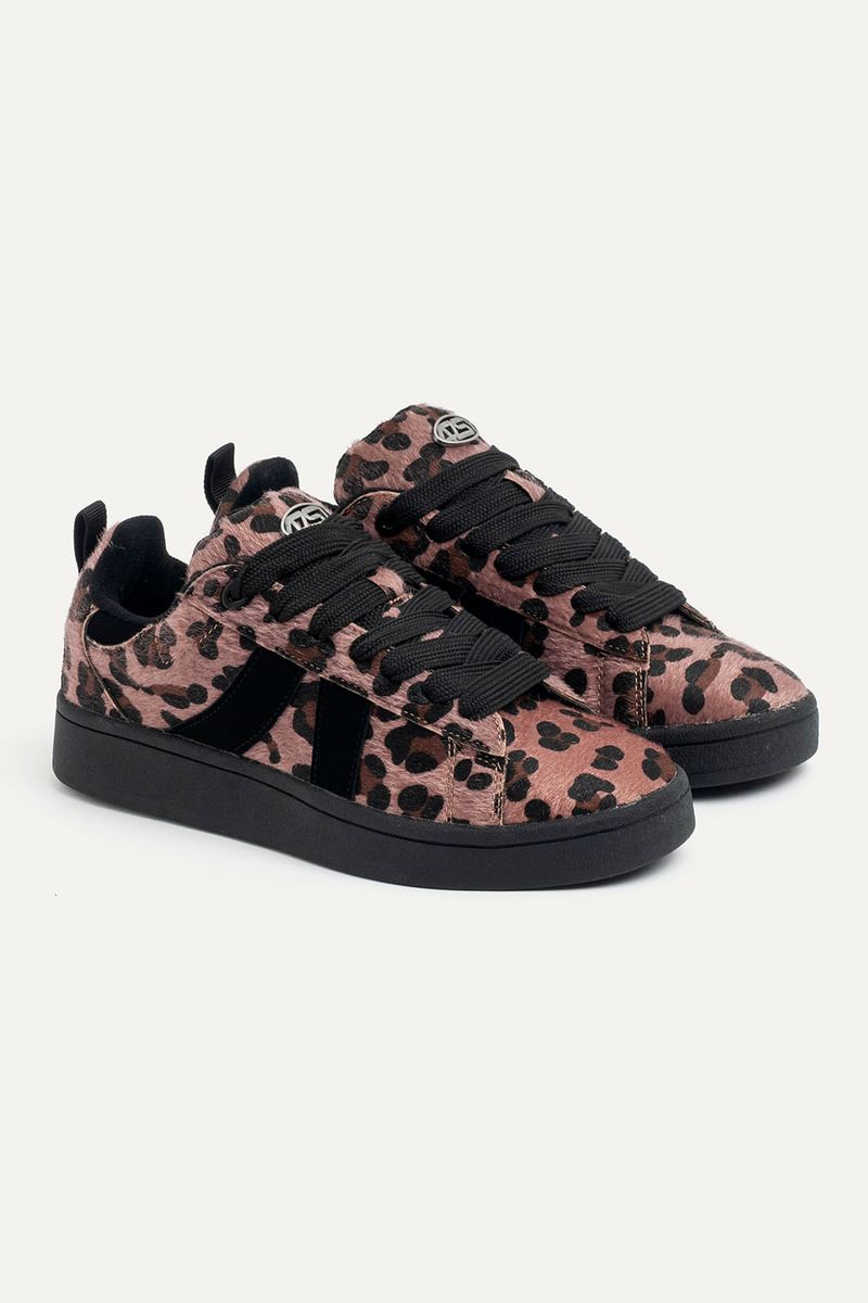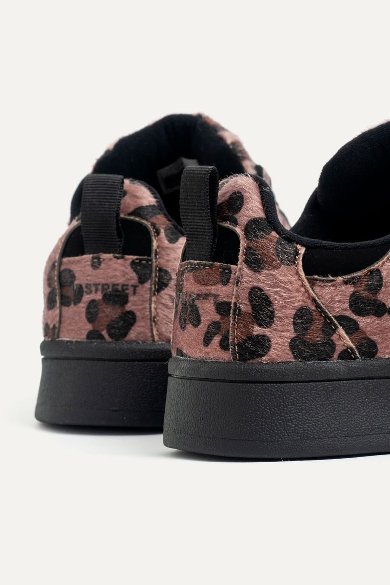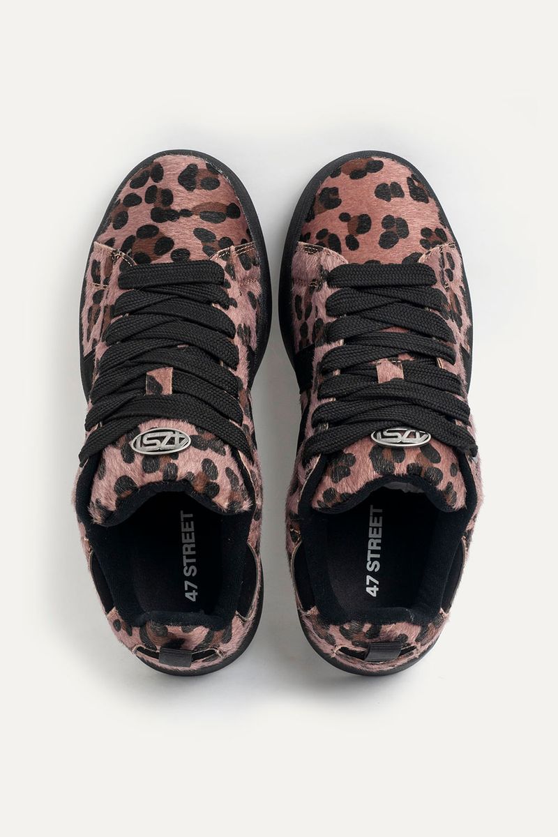 Zapatilla de símil pelo animal print con alegoría, base y cordones negros.