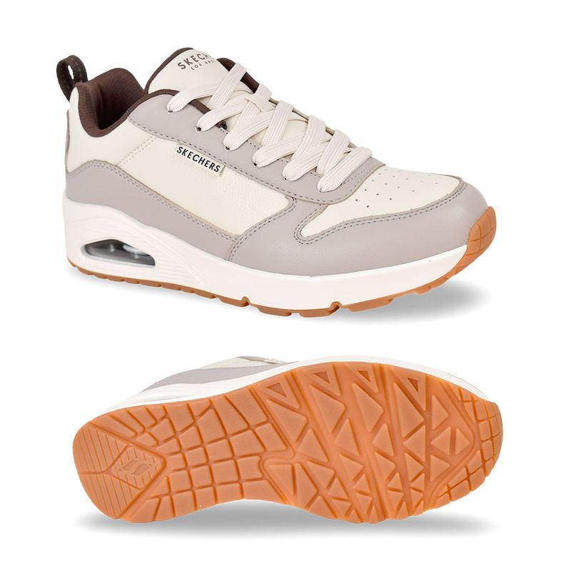 Las Skechers Uno-Alder son las zapatillas urbanas perfectas para el uso diario, diseñadas para brindar comodidad durante todo el día sin sacrificar el estilo. Su combinación de colores neutros y tecnología de amortiguación las convierte en un básico versátil para tu guardarropa. Cuentan con una plantilla Skechers Air-Cooled Memory Foam® que se adapta a la forma de tu pie, distribuyendo el peso y proporcionando un confort instantáneo y transpirabilidad. La entresuela incorpora una cámara de aire visible Skech-Air® que absorbe los impactos, añade amortiguación extra y ofrece una sensación de ligereza al caminar. La parte superior de cuero sintético liso en tonos naturales y detalles en marrón (como en la lengüeta y el tirador del talón) ofrece un look clásico y fácil de combinar.