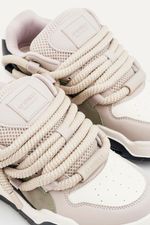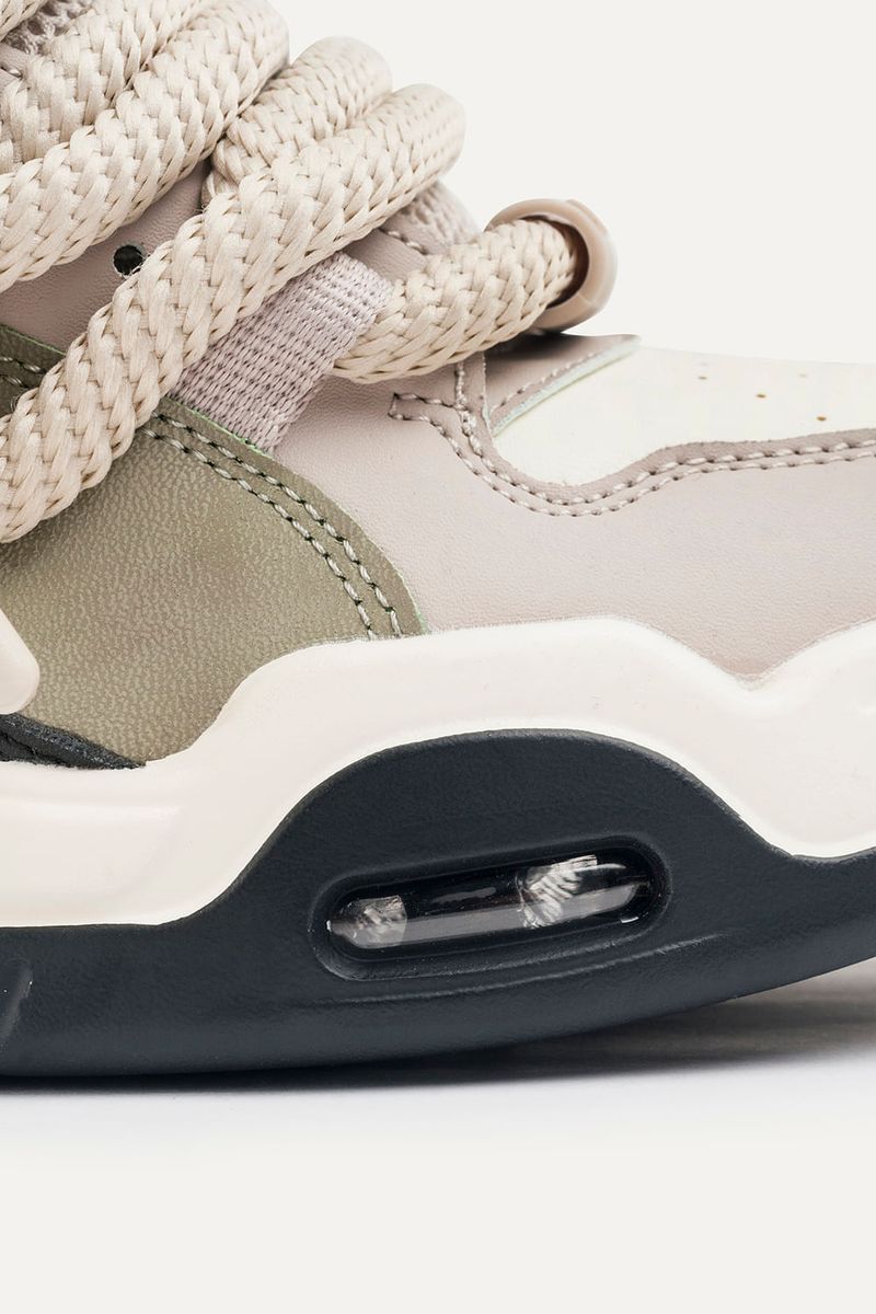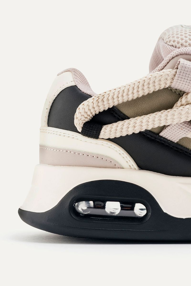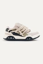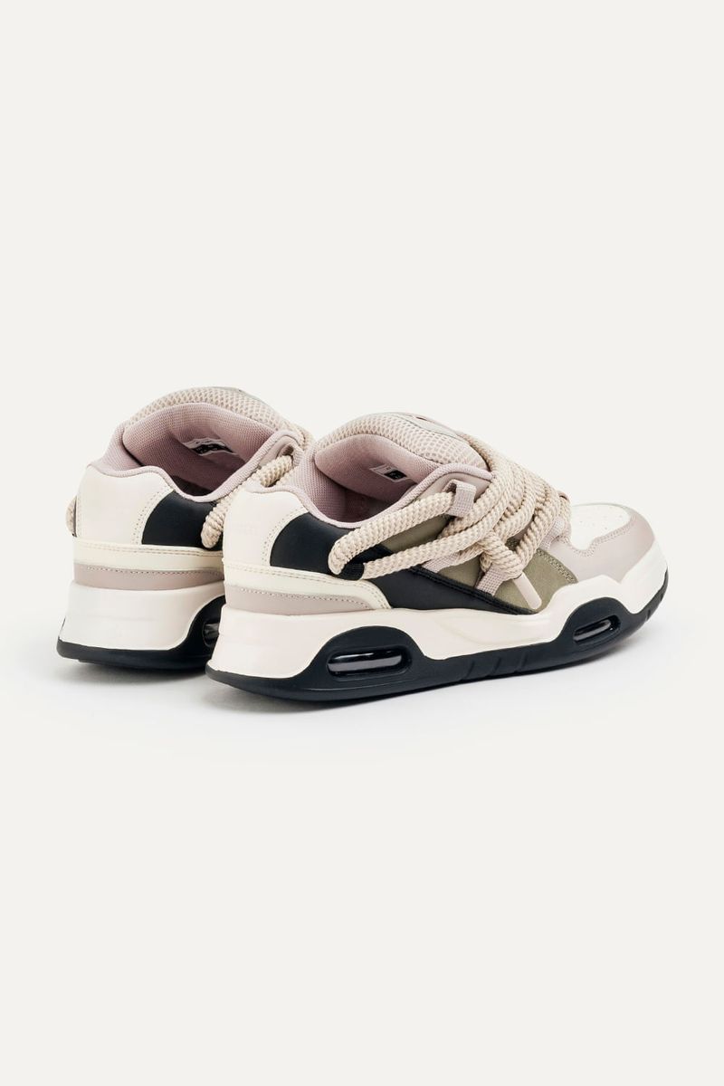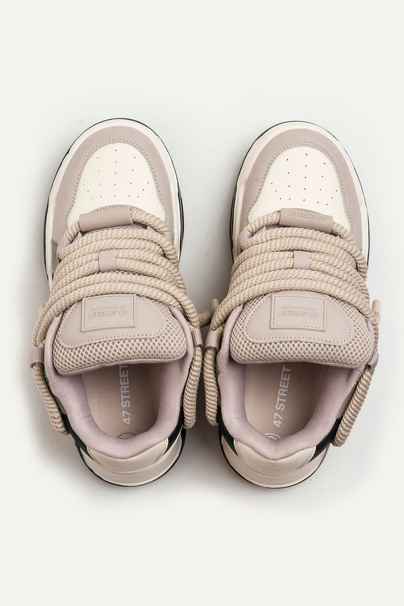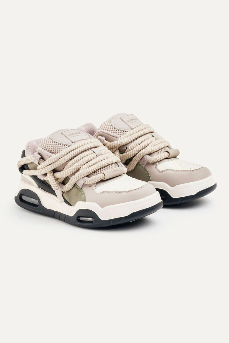 Zapatillas de símil cuero (PU) con recortes. Base con cámara de aire. Contiene cordones gruesos redondeados. Con lengüeta rellena e interior con tejido respirable. Viene con un par de cordones extra para intercambiar.