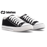 Zapatilla clásica lona negra Detalles Capellada en lona negra Forrería hecha 100% de algodón blanco Plantilla extraíble confeccionada en goma eva y base textil Cordones de algodón blanco Etiqueta textil con logo color blanco en lengua Ojalillera de aluminio Suela exterior y banda de caucho vulcanizado de alta resistencia Buepe y contrafuerte de caucho