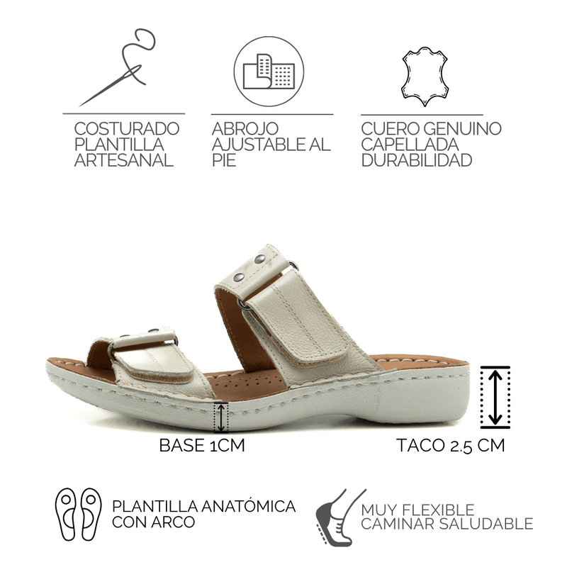 – Cuero genuino: tiras ajustables que se amoldan al pie con suavidad y resistencia.