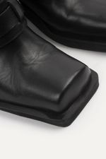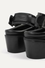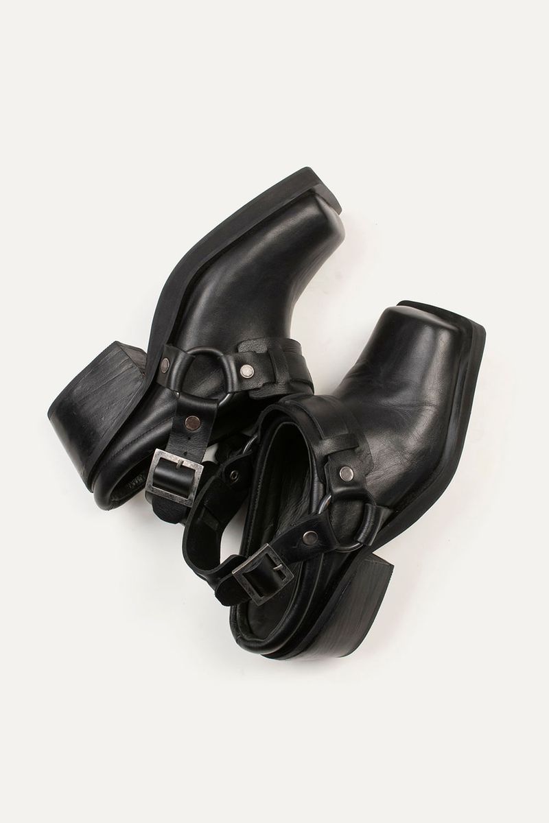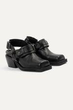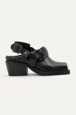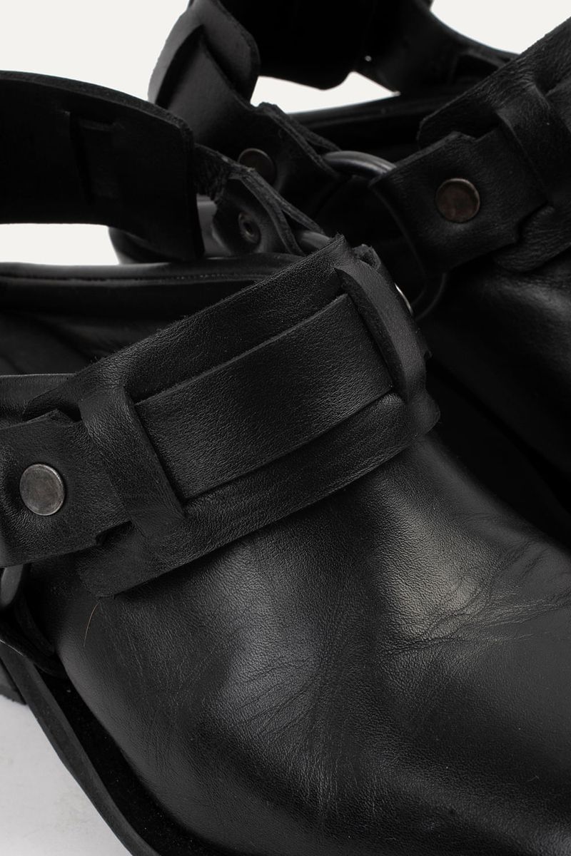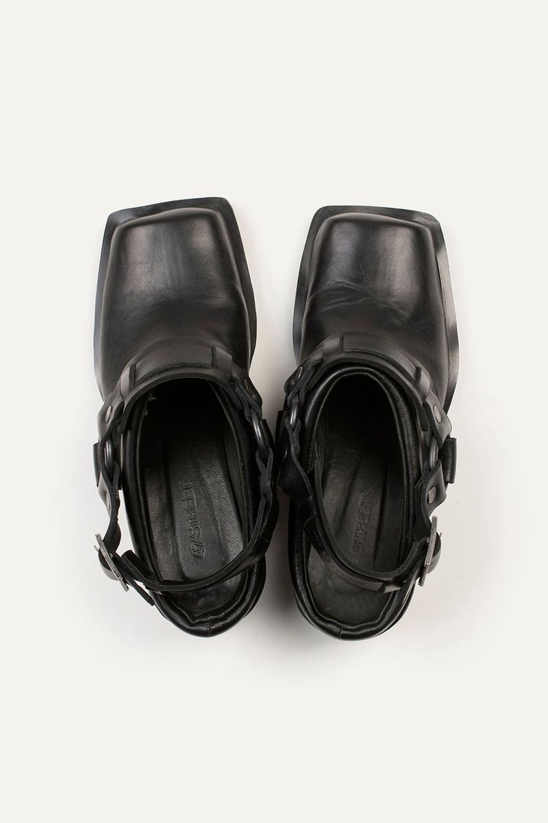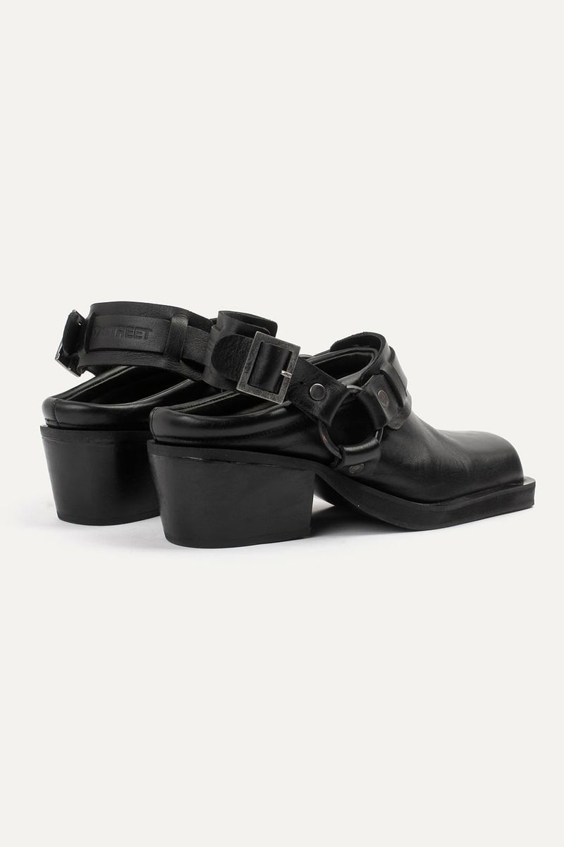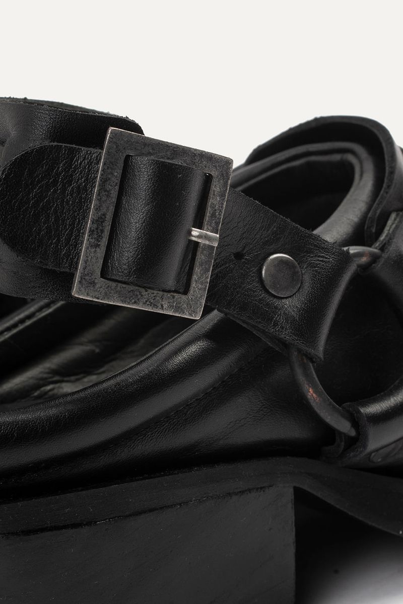 Zapatos tipo zuecos de punta cuadrada con talon descubierto y taco, llevan cinturón con avíos metálicos color niquel viejo. Confeccionados en cuero vacuno.